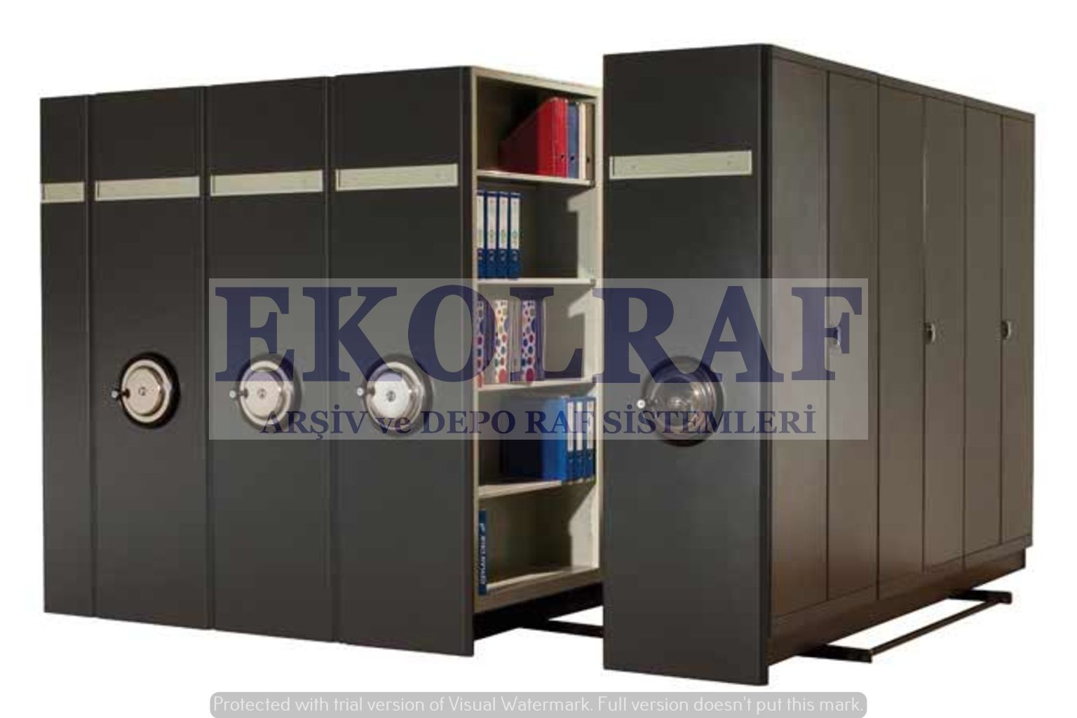 Sistemin hareketlendirilip durdurulması şasi tabanına ve dolap gövdesine bağlı dişli sayesinde kolay ve rahat bir şekilde sağlanmaktadır.Dolap ön yüzlerine koyulan lastik fitil sayesinde tozdan korunmuş olur.